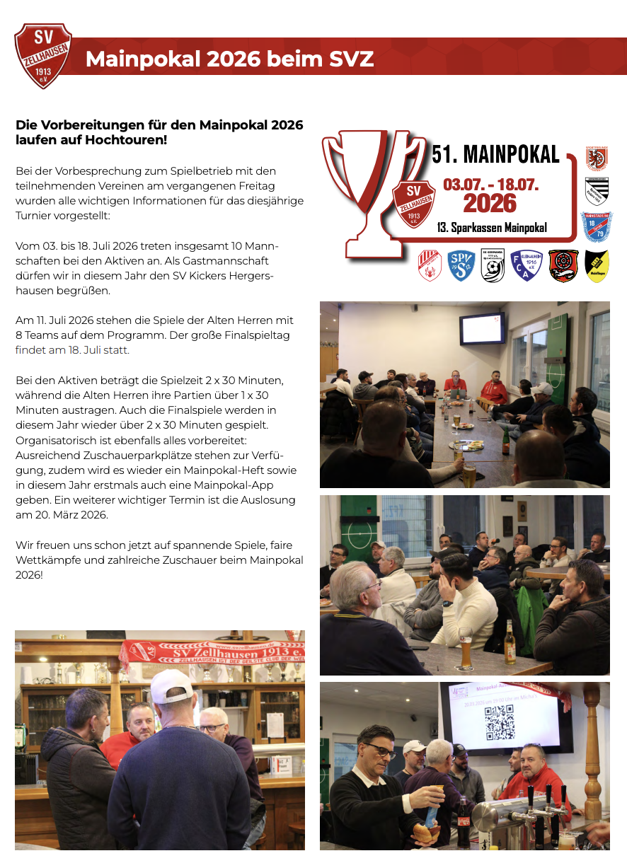 der SV Zellhausen richtet vom 03. bis 18. Juli 2026 den Mainpokal aus – ein sportliches Großereignis, das weit über die Kreis-Grenzen hinaus Aufmerksamkeit genießt und jährlich mehrere tausende Besucherinnen und Besucher anzieht. Für dieses Event möchten wir Sie als Partner und Unterstützer gewinnen.